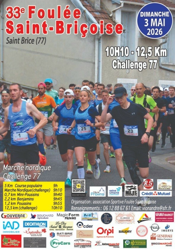 Retrait des dossards à la salle des fêtes de Saint-Brice, le dimanche 3 mai de 7h45 à 10h05.